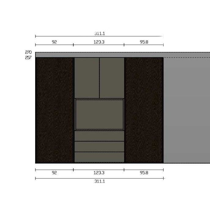 За первой дверью скрыты две штанги, стандартная снизу и штанга с механизмом опускания рычагом. За второй дверью три полки и стандартная штанга. Верхние распашные дверцы скрывают две большие полки. Посередине ниша с полками поменьше.
