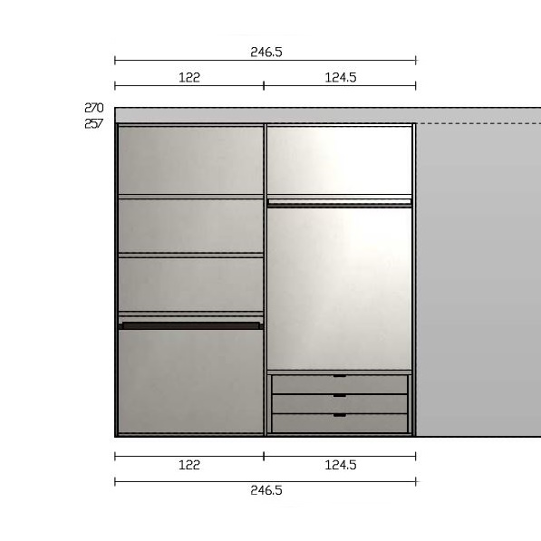 Первое отделение имеет три большие полки и брючницу снизу. Второе отделение оснащено штангой, полкой и тремя выдвижными ящиками.